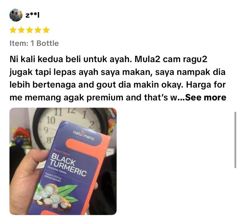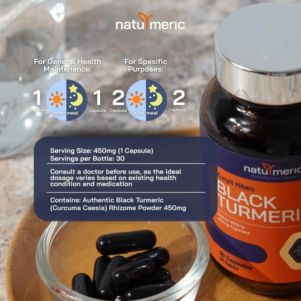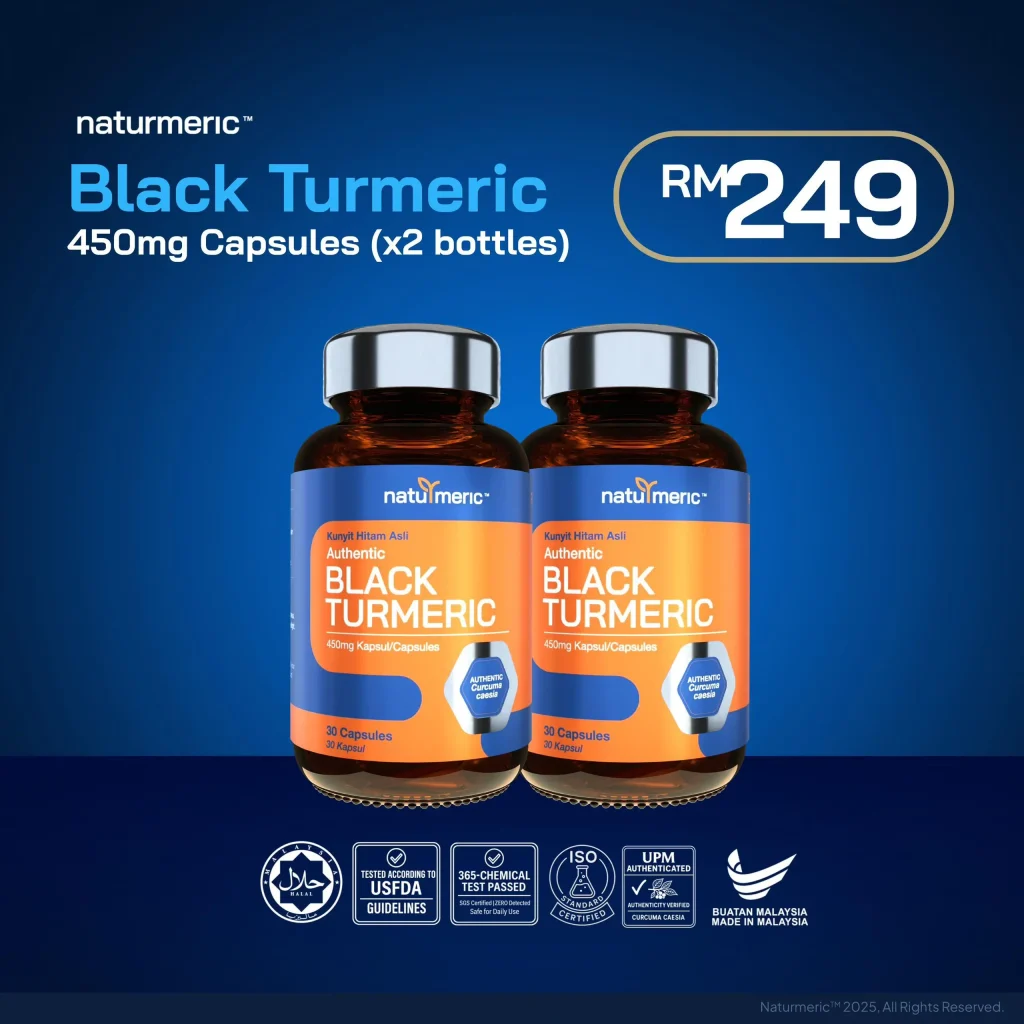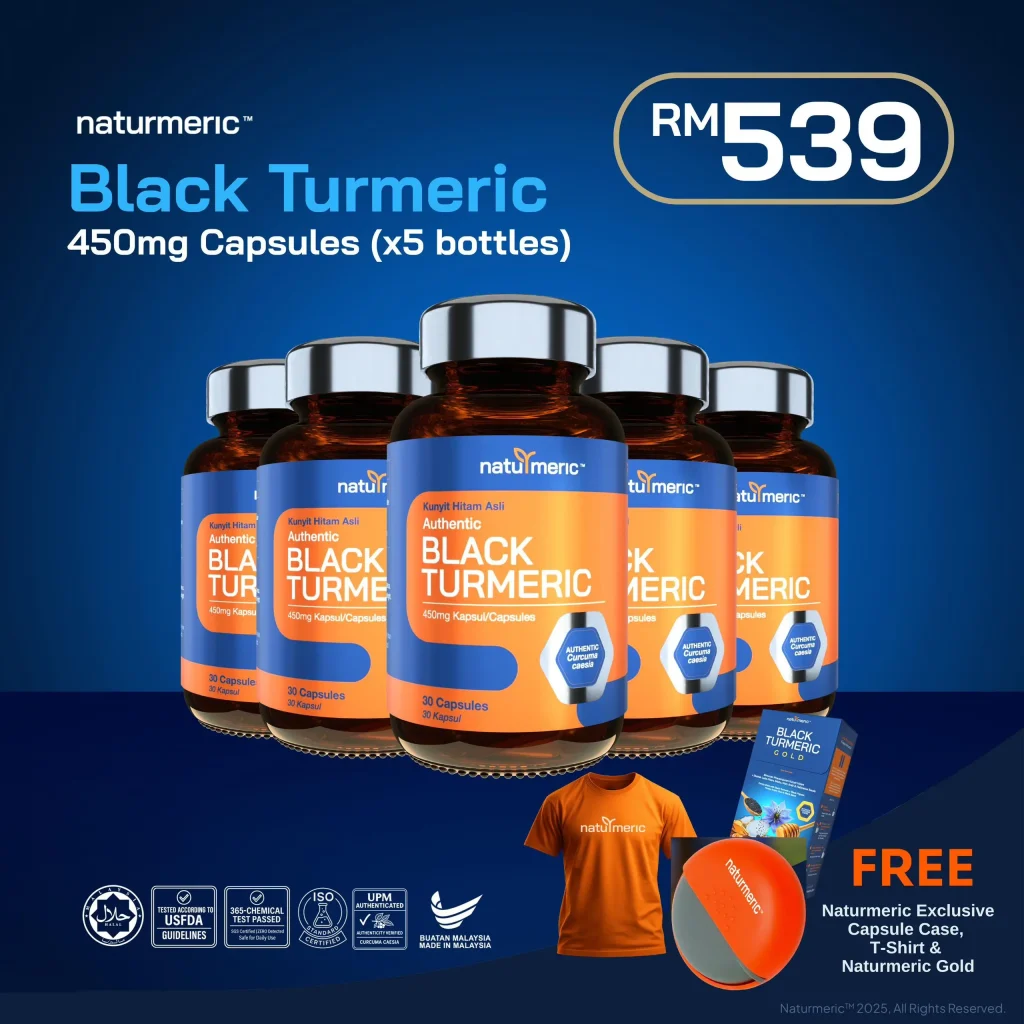 Kunyit Hitam dalam NATURMERIC mengandungi sehingga 10 kali ganda lebih curcumin berbanding kunyit biasa — menjadikannya jauh lebih berkesan dalam melawan keradangan kronik, menstabilkan sistem imun, serta membantu menurunkan kesakitan dan paras asid urik secara semulajadi.