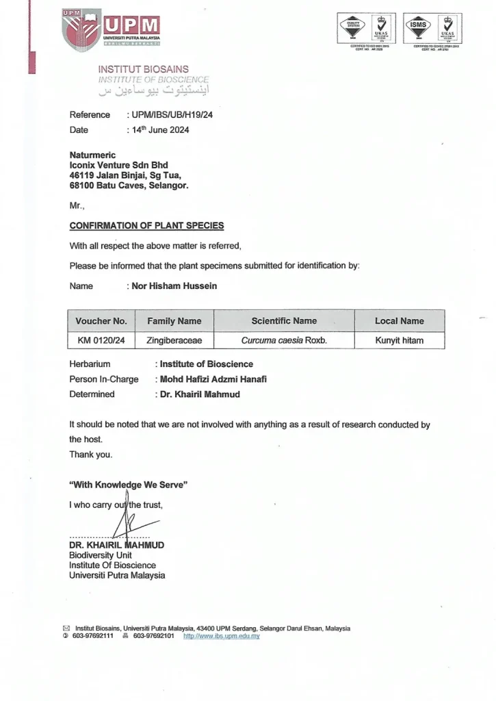 - Spesies kunyit hitam disahkan oleh universiti tempatan untuk memastikan ketulenan dan pengesahan identiti tumbuhan.