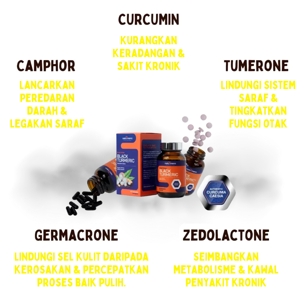 NATURMERIC adalah suplemen kesihatan berasaskan ekstrak Black Turmeric (Kunyit Hitam Asli yang telah disahkan oleh University Putra Malaysia,UPM), Herba yang jarang ditemui dan bernilai terlalu tinggi yang kaya dengan curcuminoid dan antioksidan berfungsi menentang keradangan kronik — iaitu akar utama kepada pelbagai penyakit moden — serta menyokong pemulihan tubuh secara menyeluruh tanpa bergantung pada ubat sintetik.