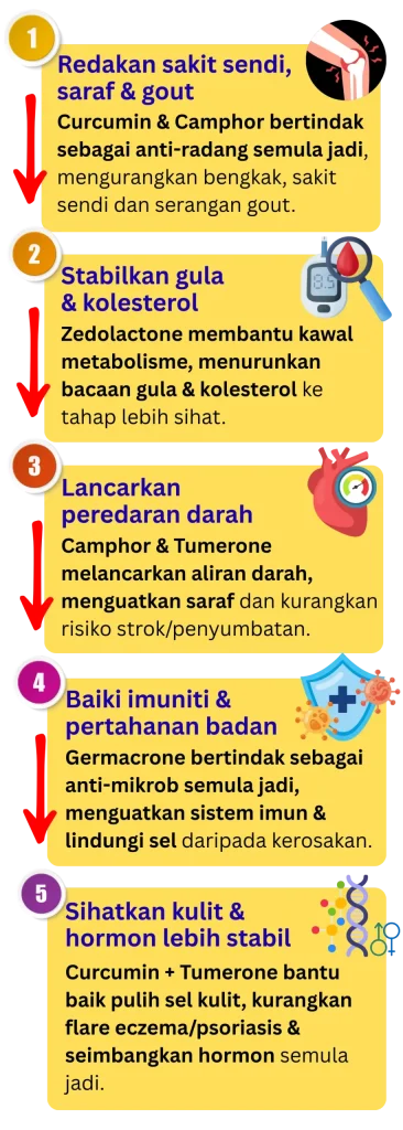 - 5 Komponen Utama Anti-Radang & Antioksidan – Curcumin, Camphor, Tumerone, Germacrone & Zedolactone