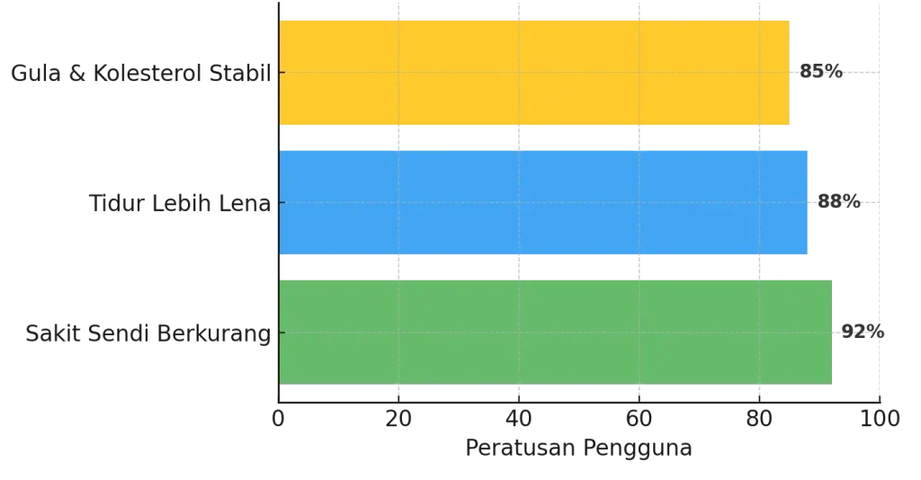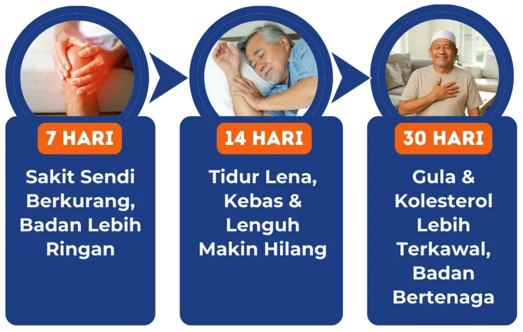 Kebanyakan pengguna melaporkan kesan positif dalam 2-4 minggu penggunaan konsisten. Untuk kes kronik, disyorkan penggunaan selama 3 bulan untuk hasil optimum.