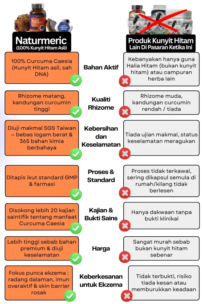 Ramai tak sedar — di pasaran ada yang hanya claim kunyit hitam, tapi sebenarnya guna bahan murah tanpa curcumin & komponen aktif sebenar.